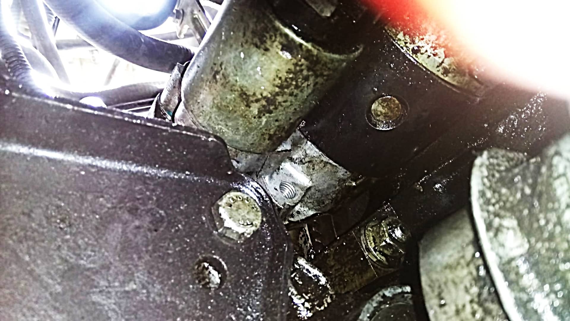 Il y a 3 longues vis dont la tête (taille 16) se trouve soit coté démarreur, soit coté moteur, selon les modèle. Ici, 2 sont coté moteur et la 3ème coté démarreur.